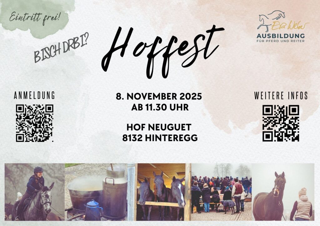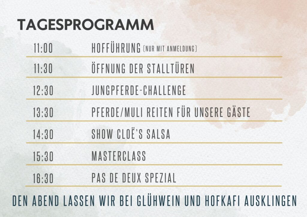 Ab 11.30 Uhr kannst du auf dem Hof Neuguet Hof- und Pferdeluft schnuppern. Dazu gehört natürlich Glühwein, Punsch und „Kafi uf em Füür“, feine Kürbissuppe, leckeres Risotto und Köstlichkeiten wie Kuchen und Sandwiches. Nicht zu vergessen den Schogg- oder Hotdog über dem Feuer. Ein Outdoor Event vom Feinsten, bei dem du dich von der Natur und den Pferden inspirieren lassen kannst. Verschiedene Präsentationen sorgen für einen Einblick in den Alltag auf dem Hof Neuguet und die Kinder und Kind gebliebenen können sich von www.glitzerchiste.ch schminken lassen und auf unseren Maultieren und Pferden eine Runde reiten. Geniesse einfach die frische Luft, Musik und einen Kafi-Luz.